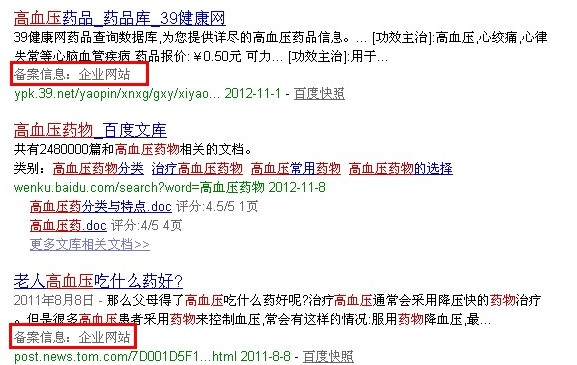2012年11月8号和往常一样到公司打开电脑查看下手里站的情况。发现这些网站的收录、链接、关键词排名都有不同程度的波动,而更让我惊奇的是,百度对于医疗、医药网站,又进行了如下图的一些备案信息备注: