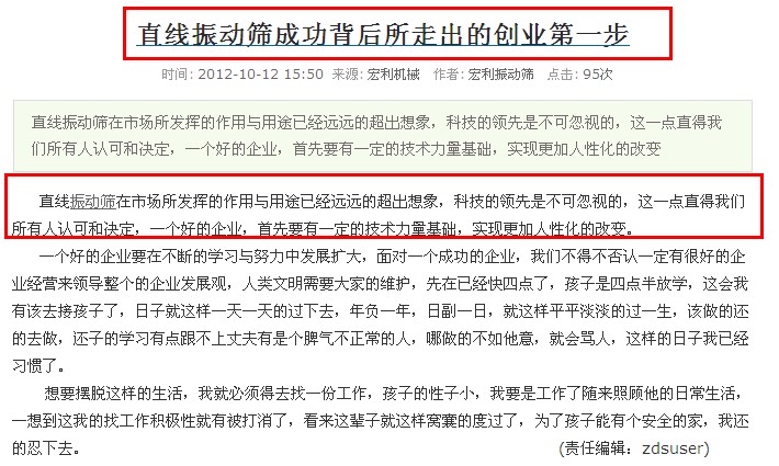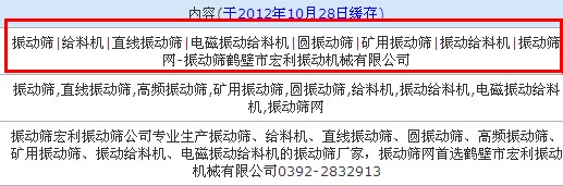 说心里话,我不是很喜欢这样的标题,因为这样的标题再如何看,都是大量堆积关键字的实况,大量的长尾词放在一起,堆积而不是巧妙的穿插在一起,这本书相对而言就是对seo的标题制作的基本功的考验,在飞云本身观察标题之后,发现这个网站始终围绕着两个重点,那就是“ 振动筛 ”和“ 给料机 ”,这两个关键字进行排列组合长尾,但是当大量的关键字都充斥在title之中时,唯一感觉到的就是凌乱了,如果可以讲这些长尾关键字用词语进行排列组合,我相信本身而言会更加合适。 继续观察关键字的情况,一般飞云分析关键字的话,就是看每一张页面所存在的固定链接到底有哪些,分别是什么关键字引导的,而且本身而言,该链接第一次出现的文本会更加重要一些,那么就检查一下内页的一些常用链接,发现如下情况。 其中链接到主页的截图为: