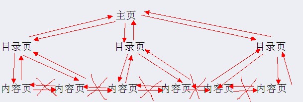 除了上图中有的“上一篇”和“下一篇”之外,没有任何一个附属的链接性传递,所以,我们可以观察到这个网站的结构为如下所示,