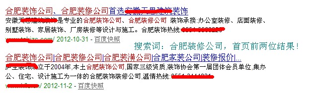 如果给我一个新站,我该怎么去优化?以区域性的装修行业的标题书写(上图)为例:早期我们发现,百度中文分词合肥装饰公司,合肥装修公司,合肥装潢公司意义一样,而合肥装饰,合肥装修,合肥装潢意义不一样!再加上这些词基本上是业内人士搜索,实际效果也许没有“合肥最好的装饰公司”好。按照目前的百度用户体验至上和提高点击欲望的规则,新的网站可以这样命名(下图)。再把这样的思路运用到其他领域,你的SEO道路也许不再艰难。