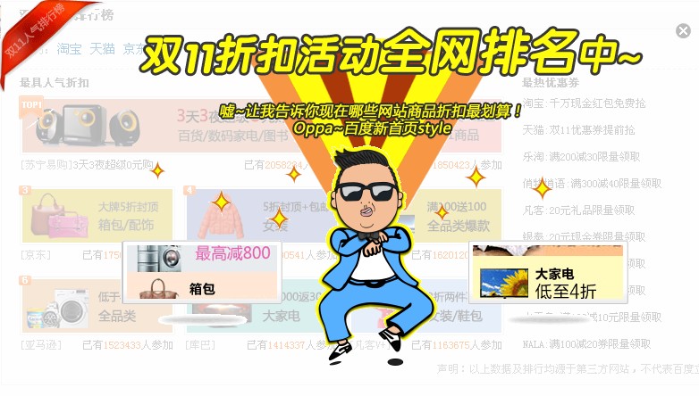 由于最近双11的到来,电商们都纷纷争着这块双11“碳”,能温和一下自己的身体。一般来说,对于这种场面百度是很少参与的,因为作为一款搜索引擎好像没有必要那么关注电商。但是现在百度大改以往“高傲”的作风,在百度首页上添加一个首页style,下面我们来简单看一下界面。如果我们登录百度账号,进入百度首页,我们可以看到一个类似一个信息提示框。