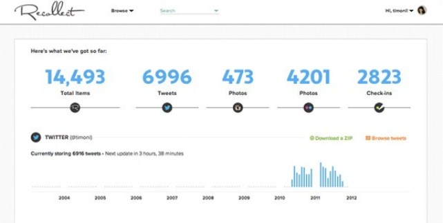我们一般都拥有好几个不同社交网站的账户,这就给我们带来了不少麻烦。不仅更新麻烦,更重要的是,我们分享的内容极为分散,想备份一下就会非常的麻烦。而且万一这些网站倒下了,我们的数据可能就不复存在了,这是一个很严重的问题。 有不少创业者已经开始关注并尝试解决这个问题,比如我们昨天报道的一款同步管理多个社交分享网站的照片的应用Woven,今天我们再给大家介绍一个非常好的备份应用——Recollect。三位Flickr的前员工一直在努力尝试解决我们前面提到的那个问题,他们花了一年多的时间进行研发,最终创造出了Recollect。 Recollect可以帮助用户备份自己的所有社交数据,比如Twitter上的推文、Foursquare上的签到数据,以及用户在各个社交网站上分享的照片。此外,Recollect还提供了非常强大的检索功能,用户搜索起来非常方便。比如,如果你想找找前段时间在Instagram上发布的狗狗的照片,不用去翻,直接用Recollect搜索即可;如果你想找之前自己在Foursquare标记的最好的咖啡店,用Recollect搜索即可;如果你想找之前发的一条推文,不用再一页一页的翻了,用Recollect搜索吧。 这几来有不少创业公司推出了一些类似的服务,帮助用户备份自己的数据,不过之前的这些应用和服务基本上都是针对特定服务的,比如专门备份Twitter工具,Recollect支持的服务则更加的广泛。同时,Recollect发掘了此类应用的另一个功能,他们称之为“再发现”——帮助用户分类和挖掘他们的以前分享的文章、照片等内容。Recollect在备份数据的同时还会对用户的数据进行统计和可视化,自动生成精美的统计图(如下图)。在这点上,Recollect还有点类似于Everyday.me和Timehop这样的时间线生成应用。Recollect的团队目前也在继续改进Recollect。Recollect的创始人之一克里斯托弗·马丁(Christopher Martin)表示他们要创建一个“智能备份”工具,帮助用户浏览和发现自己以前分享的内容。