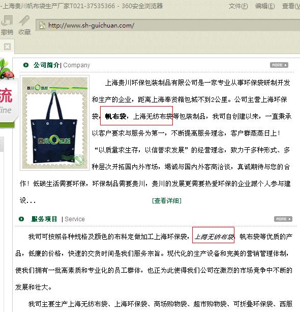 此时优化关键词排名有所下降,且出现的这种情况,我总结为波动关键词上海无纺布袋、帆布袋特殊效果放的太近,然后把上海无纺布袋一词的倾斜效果放到第二段中。如下图: