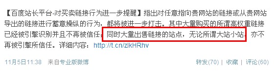 从11月5号百度一篇新闻稿告知大家,百度要进行链接的算法更新了,就让我一直观察到现在,看看百度到底对于链接购买的网站有多少的效果,看看百度对于链接这一块到底产生了多大的大影响,也试问一下,链接交易买卖是否真的已经穷途末路了,毕竟现在的我们有时候还是需要使用一些外链才能让我们的网站更加稳定,产生最好的效果。 百度对于购买网站的链接会处置吗? 在那一天,11.5号百度发布了官方消息,说购买链接的网站将被百度的算法监控从而失去竞争排名的机会,这让很多站长和公司广泛传播,但是试着想一下,购买链接到底是从哪里来判断的呢?就比如说我购买了一个外链,百度是怎么判断出来的呢?如果是这样的话,你直接给你的对手买上成千上百的链接,那他不是直接降权了吗?所以说,在标准这一块看来,只要你不过分,买一些外链是很有好处的。 但是买链接的话也是需要我们站长有一双善于观察的眼睛,为什么呢?就比如说,一个网站的外链大量的被出售,然后挂上了成千上百的外链,如果我没有猜错的话,这会被百度认为是链接工厂,也就是垃圾链接的传输地,这种页面如果有价值的话,百度就不用混了,PS:这种情况大行业站除外,百度对这类站有偏见。在我们小站长眼中过买链接的时候,还是不要去找一些中间机构,而应该直接去联系站长,这两者之间的区别是,中间机构的网站你是无法控制的,基本上都是垃圾的外链,很多都是到处链接300-500的,这样的站挂上去对自己的网站实在是一份伤害,还是不要使用了。 而关于直接联系站长的话,现在有很多人都直接在群里喊,“求购个人站长的外链”相信也是了解到,只有这样才能获得一些比较好的外链,这种网站一般还是精心维护而到的,只有让百度信任的网站,所传递的链接才是有价值的,而这些信任的站中,个人网站也是占有了很大一部分比例的。所以说,如果你需要链接的话,直接去找这样的站长,然后彼此建立信任的空间,相信可以得到权重的传递的。 百度对于出售链接的会处置吗? 这几天的观察而看,百度对于出售外链的链接还是有一定的收集的,但是笔者观察的很大一份行业性网站却没有得到降权,具体来说呢,就是说百度打击外链还是对于域名权重看的很重,一些域名权重很高的,内容上对于用户已经有了一定的基础的时候,还是不舍的降权的,造成了大网站和小网站的差距,这在我们眼中就是最鄙视的偏袒。毕竟如果一个链接1个月100的话,那么几百个链接一年下来就有不少钱了,这让其他小站长情何以堪。 关于出售链接,还有一点就是链接平台的代码追踪,的确很多人挂外链都是通过平台代码来直接上架的,上次在百度的微博之中也关注到了这一点