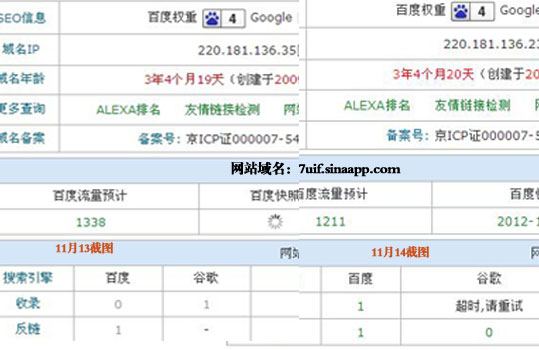 首先我买你看到的是昨天和今天的图片比对,我们明显的看到了他们的最关键的地方在于一个收录为0一个为1,可是它的权重却达到惊人的4,这是为何。我们接下来看看那个收录1的时间。