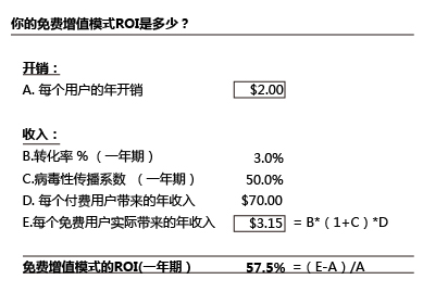 注:这个图表没有考虑用户流失。假如考虑用户流失,那么免费用户的数量还要再大,或者转化率还要再高。 2.免费模式的ROI(投资回报率)。除了要瞄准大市场以外,还有一点是,你需要保证,你通过免费用户吸引的(直接或间接)付费用户,他们带来的价值要超过你为所用用户服务产生的开销。正如我们在文章最开始提到的,免费增值只有在边际成本很低的情况下才适用,也就是说,你每增加一个新用户,你都不需要很多额外开销(这也是为什么软件相比硬件更加适合免费增值模式)。 通过对比你为服务这部分免费用户花费的成本,和你通过这部分人带来的付费用户中获取的收益,你可以计算出免费增值的ROI(看下面这个假设案例):
