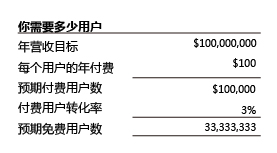所以,假如你用的是免费增值,而你又想成功,那么你的产品要么得能随着时间的增长给用户带来更多的价值(从免费到付费的直接转化),要么就具备病毒式传播能力(吸引新客户)。有一些走运的公司具备这两种属性。比如说Dropbox和GitHub,一个免费用户通过文件分享/公共信息库的共享这一行为为公司拉来了新用户,然后,随着他们对内容存储需求/私人分享需求的增长,这部分免费用户中也有很多人变成了付费用户。 而一旦你已经确定你的免费用户为你的业务带来了价值,接下来就要确定你的这笔账算得没有错: 4.确保你的这笔账没算错 免费增值模式会从本质上颠覆你的业务经济,而这既有好处也有坏处。即便你觉得你投在免费用户上的时间资金“物有所值”,你还是需要了解整个业务经济,并确保他们能为你所用,这样你的业务才能真正繁荣。这里面你最需要做的两大分析是: 1.市场规模:只有当你的市场规模足够大时,免费增值模式才是奏效的——这也是为什么诸如Dropbox和Evernote这类公司会将目光瞄准那些大型的垂直领域。因为,一旦你将产品的初始价格定到了零,那么你的付费版产品的价格也很难高上去。另外,因为你已经提供了一个免费版,所以你也将很多潜在的付费用户给扼杀了。正因为这部分用户中有很大一部分用户都是免费用户,所以只有当你的用户基数达到了上百万,你的付费用户才不至于太少。 大部分免费增值公司的付费用户转化率都在1%到10%之间(平均是在2%到4%之间),而一个典型付费用户的开销每年也不超过几百美元。所以,假如你想让公司的年营收达到1亿美元,那么这就意味着你需要获取上千万的用户(看下面的这个图表)。假如你的市场没有那么大,那么你在一开始就不应该套用免费增值模式了。