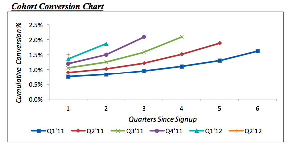 1.更好地判断转化率和留存率:用户同期组群数据为公司的产品和定价决策提供了非常好的依据。这里面最常用的一个数据分析是计算一段时间内的累计转化率(看下面的图表)。在理想状态下,这个累计转化率应该是随着时间的推移逐渐提高的(后一期比前一期的用户流失越来越少,在图表上就是后一期的数据线比前一期的数据线在图表上的位置更高 )。而且, 在每两个连续时期的组群数据中,他们的转化率数据也应该是越来越好( 每一条线都在呈下凹型上升)。