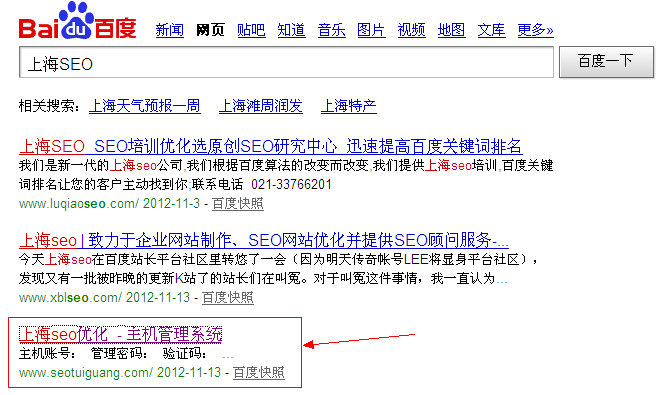 以前经常有人说2012年是世界末日,但是在SEO界也可以这么说2012是广大中小型站长的多灾多难日。之前有过6.22和6.28日事件,后来又有8.23日事件,然后百度又推出打击网站原创性不高的网站,提倡网站内容的原创性,然后就是最近的又搞出了个打击超链接作弊的行为,今年可谓是百度打动干戈的一年啊,百度的一个小小的动作可害惨了我们众多站长和SEO工作者。那么今天就给大家来数数最近在百度上看到的一些怪异的现象。 网站无程序或者网站打不开排名却很好 在百度中搜索上海SEO 这个关键词,排名在第二页,看图: