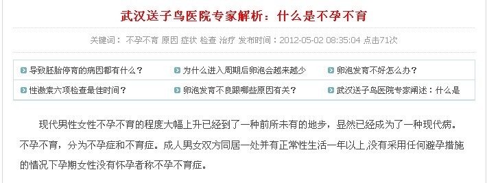 网站的收录是我们进行搜索引擎关键词排名的基础,没被收录的网页用户是无法通过搜索引擎到达你的网站,所以收录也就成了关键词排名的基本因素,但许多人对网站的收录有一定的误解,如大家通常认为一个网站的收录量越高,他的网站的权重也就越高,尤其是在交换友情链接的时候,很多人把对方网站的收录作为一项重要的考核标准,其实这个观点是错误的,其实收录多并不一定是好事情,得看具体的是收录的哪些页面,只要是需要参与关键词排名的网页,都属于要被收录的范围。对于那些不需要参与关键词排名,并且是对用户无价值的页面,我们应该进行删除或者是屏蔽。下面我们来说说如何提升网站的收录率。 1.对网站中的每一个内页进行质量控制。我们的网页中只需要提供用户想要的东西,一切用户不需要的内容都要全部删除,我们现在有很多网站都喜欢进行相关内容或者相关文章进行推荐,而他们推荐的内容很多都是和该网页所表达的内容是不相关的,会对用户形成干扰,这样就会降低搜索引擎对我们网站的信任度,如果我们网站中存在大量的这样干扰用户的内容,很容易造成我们的网站不收录。如以下的医疗站点: