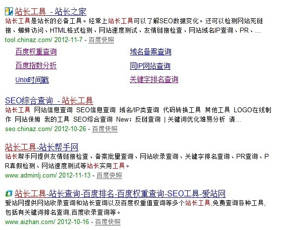 站长工具是行业内每天必用的工具,自从有了seo,站长工具便一并诞生了。站长工具中,爱站是比较出名的,因为他在查询百度关键词排名中一直是比较有利的工具;其次就是chinaz提供的站长工具,一直提供稳定、多样化的服务;再就是站长帮手网,提供的查询种类也比较多。三个互联网工具类网站,分析他们的排名,从一定程度上也能帮助我们理解百度seo优化方法。爱站在长达一年的时间里,凭借百度权重查询与众多名人推荐,一举拿下了“站长工具”排名第一的位置,可惜最近的排名却发生了微妙的变化。 先来看看他们在百度的排名: