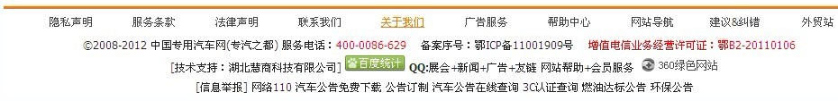 我们公司主要以生产洒水车为主,但附带也会生产一些油罐车、吸污车、吸粪车等其它车型,我们的网站关键词也是洒水车及相关词汇,并且我们公司总共的车型也就几十个产品,我们完全没必要做个全站的产品导航,这直接影响到我们网页的相似度。 底部的版权信息。我们喜欢将一些不必要的文字诸如电话号码、底部导航等。诸如下图这种,我们完全可以做到精简一些:
