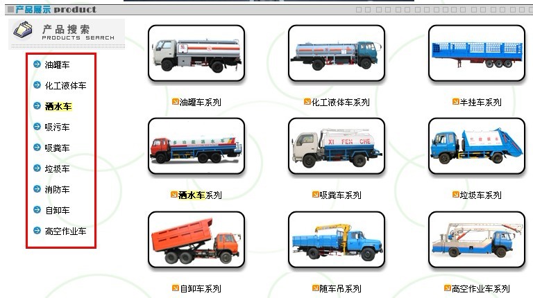 你只需要输入你要测试的两个页面,然后就会得出一个相似度的结果,用这个你可以很清楚地看出你两个网页之间的相似度。 二、如何解决网站相似度过高的问题呢?我们以常规的企业站为例。 1.企业产品的竖排导航 2.底部的版权信息 3.内容中只是图片,无文字描述 我来以我负责的洒水车行业的网站来为大家讲解。首先是全站的产品导航,请看下图: