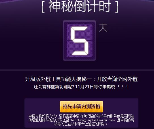 A5站长网报道:百度站长平台外链工具升级版将在11月21日开启内测,内测开启时将会邀请行业内资深人士进行优先体验,同时在百度站长平台官网也提供了申请内测资格的方式。 据了解,站长平台外链工具beta版本上线时就得到了站长的强烈关注,升级版外链工具在之前的基础上提供了更强大的外链数据查询,根据站长平台的专题介绍,包含了查询全网外链等新功能,更多的功能介绍将再内测开始时揭晓。
