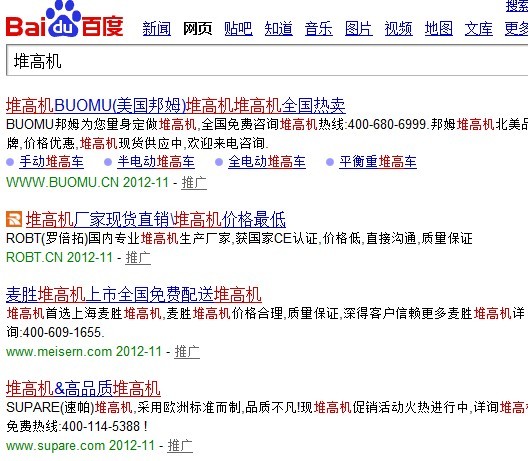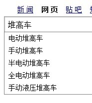 前面7、8个都是竞价网站,然后是百科类、问答类、百度新闻,这个词科普的性质强烈,这样的情况做出排名的意义显然不大。不能赢得最终的销售目的,就得另找办法。通过这个词的百度相关搜索推荐,可以看出,此产品根据功能的不同,演化出“电动堆高车”“手动堆高车”“半电动堆高车”“全电动堆高车”四个词,而企业实际生产的是全电动堆高车,这样就能更加准确的把该词定位为核心关键词,而且竞争强度不大,独立域名的网站很少。