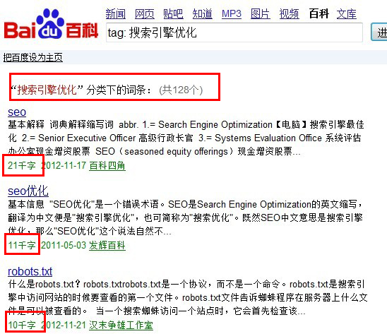 (2)内容长度 内容长度是百科创建和修改的重要指标,大家登陆百科后,首页会有推荐你编辑的词条,看看这些词条的特点,大都是只有短短的一段话,内容很短。因此,你编辑的内容如何能有高通过率,如何能顺利加链接,务必保证你的词条内容充足。 内容如何获取?很简单,用百度搜索相关词汇,把一些网站上的文章内容复制过来,编排好格式即可。 (3)错别字 错别字是经常出现的问题,在修改原因中填上错别字,很容易通过审核,但是前提是你确实修改了错别字。再者就是语句不通顺,也是一大问题。 (4)标点 百科中的用语讲究规范,现在的很多词条连基本的语句都读不通,很成问题。 (5)账号等级 高等级的账号(5级以上)会增大词条的通过率,百度产品都有这个特点,刚才已经讲了自己的方法,就是每天坚持修改上百个词条,不追求高质量,关键是有了量,经验值也是很可观的。 2、如何寻找已有的关键词词条 为了保证内容的相关性,我们必须找相关关键词,比如你的网站是关于seo的,如何做呢? (1)细化你的关键词内容,seo细分下来的关键词有诸如内链、外链、搜索引擎优化、网站等等都属于要寻找的大类tag标签。 (2)利用百科的tag指令找到这些已经存在的相关关键词,比如tag:搜索引擎优化。得到的结果如下图。