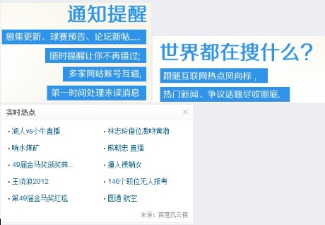 百度对于资源的整合,一般在于百度音乐的整合,当百度ting变成了music的时候,就已经注定成为了百度音乐的一部分,想要在百度首页听歌吗?这是一份很好的选择的哦,其实呢,百度音乐做的还是很好的,在页面上进行听歌,你想要搜索什么歌就直接去搜索歌名,在音乐中就可以直接播放,这就是一种很好的用户体验,但是我一般不长期这样,因为不能单曲循环,我还是打开页面然后单曲循环一下。 在资源整合中,我们可以看到小说推荐,电视剧集的推荐,这些如果你是这方面的追求者的话,那么新首页是自己应该尝试的部分,毕竟打开之后,如果你想要得到这方面的信息的时候,新首页是可以满足你的需求,便利性再一次凸显。 d)通知提醒+实时热点,变化让你了如指掌