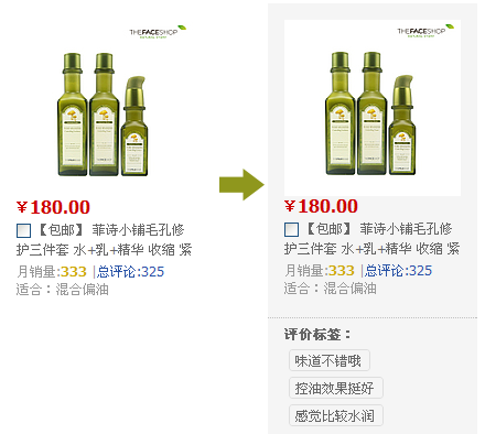 商品展示的一些交互效果 hover单个商品区域:出现方框,强调用户选中该商品所包含的区域。 出现附加信息:展示用户更像进一步了解的内容 商城的化妆品LIST中,展示用户对商品的使用感受