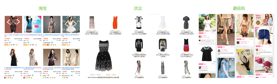 商品聚集页: 顾名思义,就是把商品列出来,形成具有某种共同特征的商品的汇集页面。 目的就是为了提供给消费者更多的商品选择,从而提高转换率,尽量减少用户的跳出率,保证浏览流畅。这就需要提供优质的视觉体验和良好的交互体验。 这里主要围绕商品展示来展开。 目前商品展示设计主要有3种 : 1.按行列来排序(淘宝商城….京东) 2.瀑布流(蘑菇街) 让商品最大限度的展示在用户面前 3.特殊款突出(优众) 自适应屏幕的商品展示,每个类目下,使用大图重点推几款商品或banner 错落有致的排序,适合图片优质的网站。