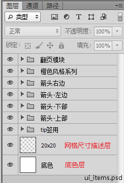 在Photoshop的编辑→首选项中可以设置合适的网格尺寸。 为方便后续编辑,拼图源文件应适当保留原UI设计稿图层(如保留文本图层,不做图层合并,方便以后的文本更改),同时做好图层命名和分组。此外,推荐在底部增加2个图层:底色层和网格尺寸描述层。
