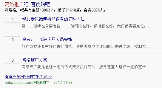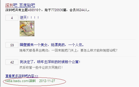 相信很多站长都知道,虽然是百度贴吧也是百度旗下的产品之一,但是相对于百度百科,百度知道,百度文库等,百度贴吧可以说是一直活跃在百度2,,3页。肯定也有不少人做过贴吧推广,但是由于贴吧的更新速度非常快,最好的效果可能也仅仅只是出现在最新相关信息或者是百度的2,3页,而且这种效果通常是很难做到也很难维持的,不仅需要靠着大量的发帖,同时对帖子的内容也有着一定的要求,这也是导致很多人对贴吧推广望而却步的原因。 但是从下图中我们可以看出,百度贴吧是排在首页第4位的,而且三个帖子同时显示,这种现象的出现无疑是非常惊人的,这是否说明百度贴吧正是百度下一个关注的重点呢?答案不得而知。