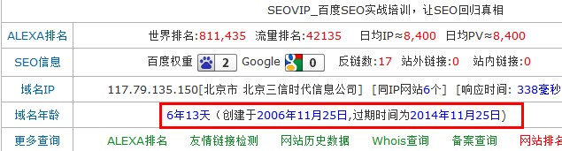 也许,我们的生活中也有很多这样类似的网站,用一张单页面就击败了更多更多的综合性网站而不为人知,也许我们正在尝试着用这样的一种思路来进行下一步的建站旅行,可是如果不能回归seo的本质,不能透彻的看百度排名,一切都会在哪里呢,下面呢,就介绍一些这个网站本身所具有的一些特点吧。 首先呢,关注网站域名情况 在最开始呢,我们看一下现在的域名状况吧,直接用工具查询到,如下图
