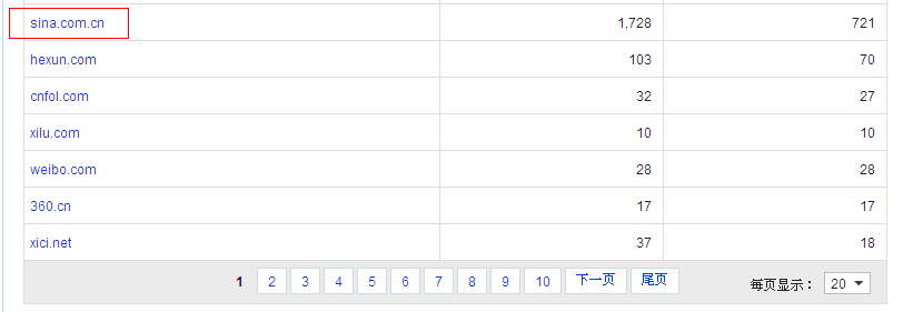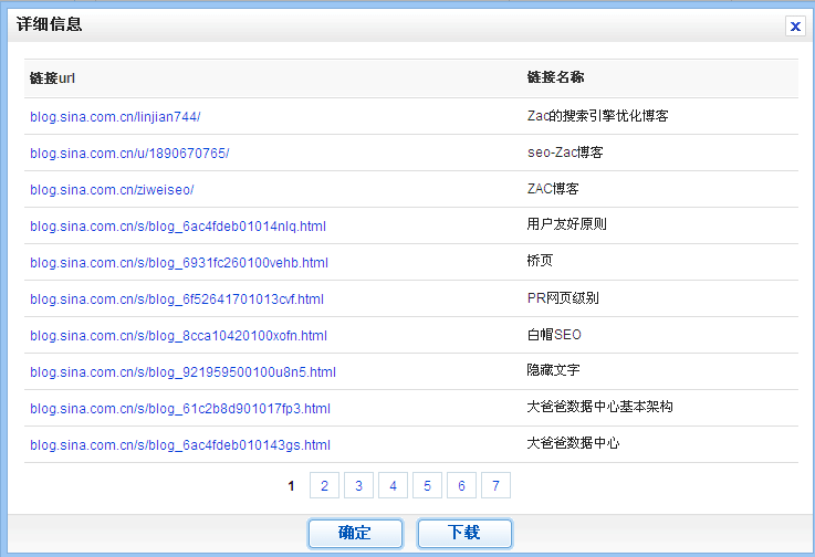 不仅可以看到非常精准的seo关键词指向seozac博客首页的外链来源,还可以下载所查到的所有数据,这无疑是给站长带来很大的帮助。 再来看从他的外链来源中我们发现其中之一的sina网的来源有1700多包括锚文本和网址,百度外链分析工具可以直接点击查看sina网的哪些页面给了seozac博客的链接来源。如图所示