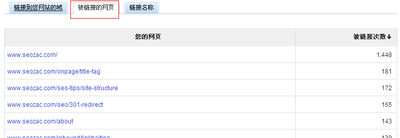 而且上图中的来源网址还可以直接点击查看,直接了解这些来源页面用对应的锚文本分别指向seozac博客的哪些页面,或者通过下图概括性的查看seozac给自己的博客的哪些页面做了外链。