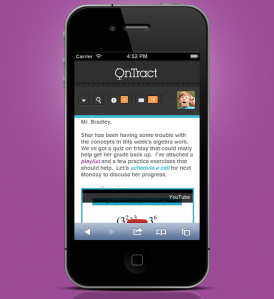 这个软件的个人学习引擎能够为教师提供一个帮助资源列表,教师们还可以将问题和这个列表以电子邮件的形式发送给学生家长。在家长方面,能够实时的访问这些信息和帮助资源,进而帮助他们的孩子解决学习困难,而不必等待教师抽出时间来帮助学生。 这个功能对于教师和家长来说都十分重要。但是,对于教师来说,Ontract最吸引他们的地方在于,这个软件可以整合多个不同的教学软件,将所有数据整合到一个界面之下,让他们不必再像以前一样需要登录多个教学软件才能获得全部数据。在现有的体系下,让学校更换已经使用多年的软件,并非易事,但是由于Ontract能够简化教师的工作,因此他们在更换软件的过程中,不会有太多的不适应,可以说这是一个“无痛转变”。