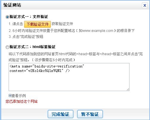 重点就是这个立即添加网站了,点开之后,可以让你输入你的网站输完之后,就会提示你下一步该做什么,最关键的一个,如何添加验证: