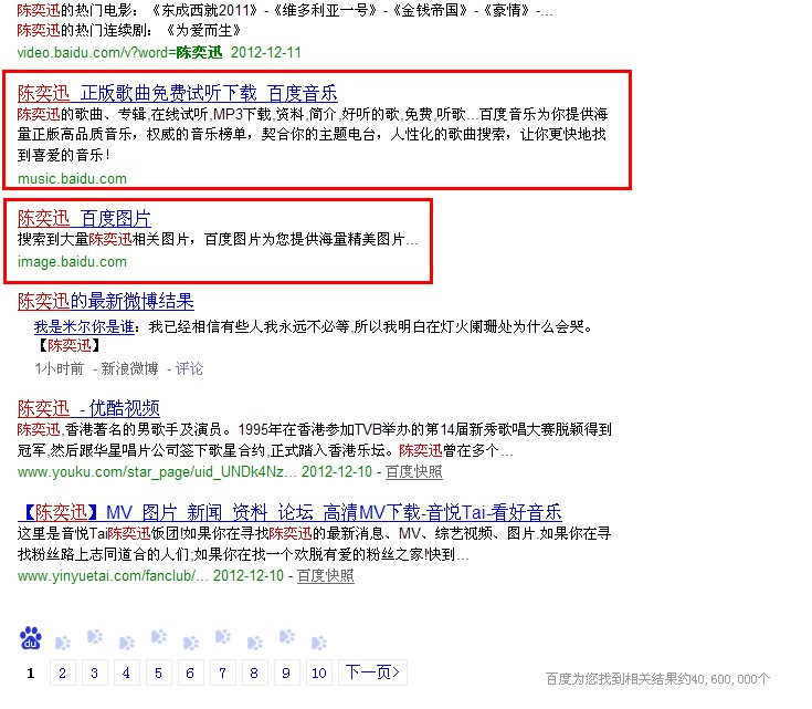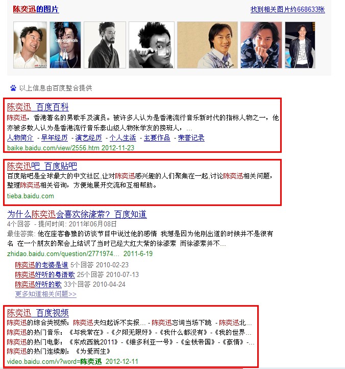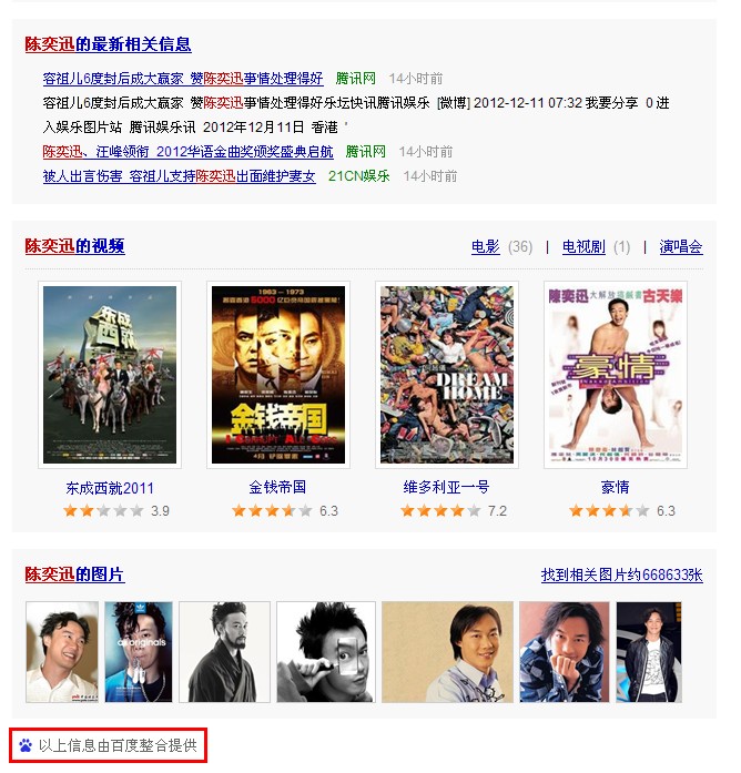 今日笔者百度搜索某位明星的时候发现百度又有新的搜索结果改进来提升用户体验,百度最近一直强调网站seo更应该提高用户体验,而最近360搜索的推出也极大的刺激了百度的危机意识,李彦宏本人也是在公司内部邮件写到“淘汰小资、呼唤狼性”等等都可以看出百度正在提高自己以应对竞争对手的围攻和自己的核心竞争力。好了言归正传,下面开始谈一下百度针对名人搜索的改版对于用户体验的提升。 以某位明星做关键词搜索,则我们可以看见以下结果: