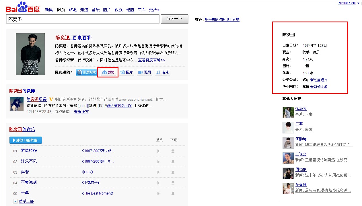先说明一下因为图片尺寸较大,所以分开用几张图片来显示说明。 那么我看上面的图片,我们会发现百度这次的改版给用户的第一感觉就是更加直观了,用了丰富的图形和图片元素。这样极大的提高了信息的直观性的同时对于用户而言更加方便我们找到我们想要的结果。 这次百度整合的基本是自有品牌旗下的内容,笔者试了好几个明星搜索,发现基本都是整合了百度百科、百度视频、百度新闻、百度图片、百度音乐等内容。当然还有些个体化差异,比如搜索的明星没有出音乐作品,那么不会显示百度音乐,很多明星信息里还会显示新浪微博链接。由于笔者测试关键词样本有限所以目前笔者并未发现有腾讯微博出现在结果列表中。 再看搜索结果右侧,百度一改传统的广告展示,改为了该明星的基本信息和其亲近的人物关系链,比如我们可以看见该明星的妻子、好友等。这一点笔者觉得还是值得赞的,毕竟算是业内首家右侧不放广告的吧。对用户体验的提升很有帮助。