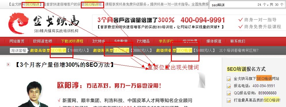 该站在导出友链方面,基本上都围绕“seo”与“网站优化”这两个词展开,可以说导入链接锚文本与导出链接锚文本做得相当出色。 3、布局 按形式来分,该站采用典型的图片+视频+文字模式。这种形式的优点是既能对搜索引擎优化,同时视频的存在,加大了网站停留时间的可能性。 按内容方面来分。 该站首页第一屏是一张图片与视频,紧接着是一些资源的下载,这些资源对seo新手十分有用,这是第一处加大网页的停留时间。接下来,就是突出该站优势,学员优化案例,学员评价与媒体报道等形式。其网页右边则是一些文章列表,这些文章列表,不仅仅能增加网站的收录,而且对网页关键词布局与优化,有着很大的促进作用。 关键词布局。笔者认为,作为单页,关键词的密度重要性远远不及关键词的位置,这一点,欧阳淳老师做得相当完美。笔者发现该站“seo培训”这个词不仅仅在醒目位置出现,还出现在图片alt中,导出链接锚文本中等。