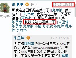 最近,seo培训这个词因为seovip这个站火了一把。自从汇道论坛被百度降权后,笔者很久没关注seo培训这个词。但是昨天朱卫坤老师发了一则微博,内容如下,激起了笔者对seo培训这词排名的兴趣。