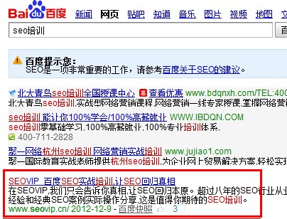 这几天时间,有一个网站挺火,那就是robin的一张单页面网站,为什么这样说,因为这个网站在短短的时间之内,就占据了百度搜索“seo培训”的第一名,不得不让更多的人感觉到思考的意义,到底是什么原因让这个网站飞舞到这样一个璀璨的位置,这样一个网站带给我们的思考到底有哪些呢,且听我慢慢的讲来吧,先送上一张排名截图: