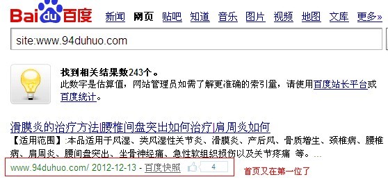 查看所有信息之后,网站的收录变成了243个。并且网站在进行site操作之后,首页重新回到了第一位。具体情况如下图: