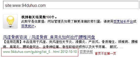 这个站是个保健品的网站,众所周知,现在百度对医疗类网站的打击力度逐步增大,保健品类的网站也受到了波及。昨天在对这个站进行操作的时候,突然发现,对这个站进行site操作的时候,网站的首页不在第一位了。具体情况如下图: