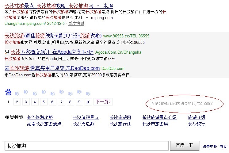 由上面的图可知,“长沙旅游”这个关键词是热度一般。还是有些价值所在。关键词研究主要研究的就是关键词的选择,关键词竞争性分析,竞争对手网站的研究。 关键词竞争性判断 根据关键词搜索量来判断,并不能根据一个方法来下结论,需要多个因素结合起来判断。 方法1:用一个关键词去百度搜索,在最下方显示“百度为您找到相关结果数”来判断。一般在十万以下的竞争性一般,稍微有点权重的网站优化一下都可以获得排名;在百万级数的,这个关键词难度有点难度;在亿万级数的关键词,难度非常大,非常热,做排名非常困难。“旅游”这个关键词已经达到亿级,做上去并非易事。 方法2:intitle数,这个高级命令的作用是,查看含关键词的标题数是多少。