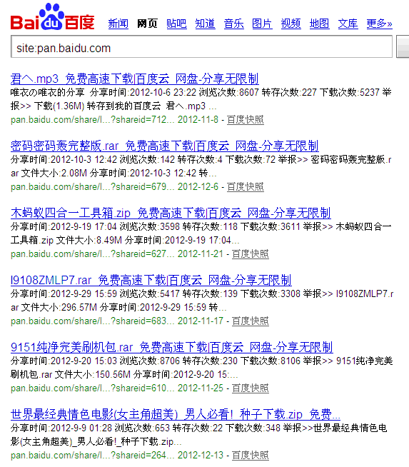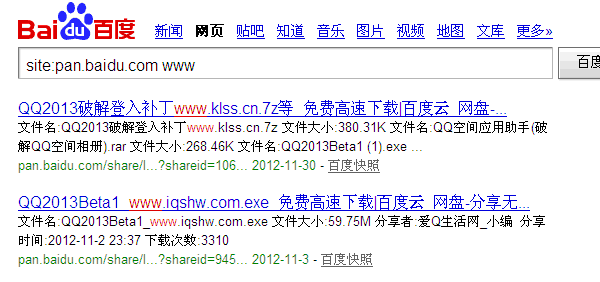 现在很多站长都抱怨外链不好发了,发了也不给加链接。其实只不过是一部分站长遗忘了外链的定义。外链不仅仅是锚文本的特权,也不是超链的版权。外链的形式还有很多种。比如视频标题介绍网址外链等这些之前很少人知道,但是现在也已经普及化。本文所要讲的是目前为止,还只是少数人使用的外链手法。 百度网盘外链手法 百度网盘是今年下半年开始上线的,是为用户提供文件的网络备份、同步和分享服务的地方。如图我们site:pan.baidu.com,你会发现,这里的内容页会收录呈现。