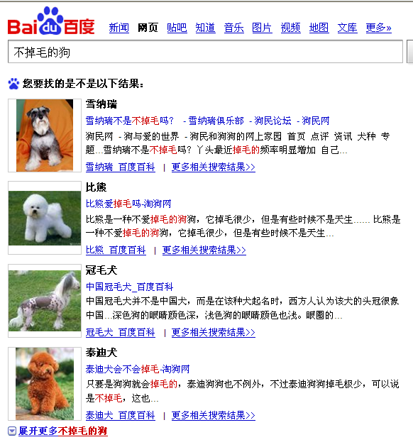 当今我们都热衷于使用国内最大的搜索引擎百度,它也是全球最大的中文搜索引擎。多年来,我们都已经习惯了百度,也有不少人非常迷恋百度,尤其是不熟悉互联网的用户,更是觉得百度是万能的。谷歌退出中国大陆之前,百度跟谷歌还在较劲,那时的百度也是活力十足,不时有让人惊喜的创新推出。但是谷歌退出之后,百度就一枝独秀了,很快统治了中国搜索市场。或许是缺乏竞争,百度也一下子松懈了,虽然小资队伍日益壮大,但是从那时起也没有太多的令人心动创新产品推出了。中国网民增长迅速,对于新网民来说,当前的百度已经有足够的吸引力了,也没有太高的要求。对于老网民来说,虽然偶尔会抱怨一下百度,但是还是基本满意的,况且百度根本没有渠道吸纳网民的意见。 直到近一两年,搜索市场的骚动加剧,不少具创新元素进入搜索市场。国内也有巨头试水搜索市场(比如360),搅动了死水一潭的搜索领域。但是在诸多创新元素当中,最具颠覆性的是这两个:实体搜索和开放搜索。 谷歌的知识图谱已经研制了两年多,2012年五月份才正式推出,目的是实现“直接给出答案”的实体搜索。开放式搜索由中国搜索引擎之父陈沛在2011年10月份提出,目的是把广大的民众智慧融入到搜索结果,实现更加丰富和个性化的搜索。 然而这两者虽然都是搜索界具有颠覆性的创新,也代表了未来的趋势,但是两者的方向却有相背离的尴尬。 首先,未来的搜索需要实体搜索的深度和精度。“所搜即所得”、“直接给出答案”是现在众多网民的追求,这种搜索更加精准,更有效率,所触及的内容深度也足够,可以很快给出让人满意的答案。比如说像先前测试的“不掉毛的狗”,直接给出这种整理好的狗的品种,如图: