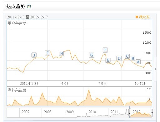 比如一个用户想在百度进行搜索购买平板电脑,如果标题上出现笔记本电脑,这个对用户来说就是有干扰性的,因为购买平板电脑的人可能不愿意关注笔记本电脑的相关信息,对于想购买平板电脑的用户来说,一切和平板电脑无关的其它信息我们都可以理解为干扰用户的内容。而如果我们做一个只出售平板电脑的网站,里面全部都是关于平板电脑的相关信息,标题中也全部是用户比较关注的内容,如平板电脑价格、平板电脑图片等,这样的网站将会获得更多用户的点击,那么它所获得的权重就越高。 二、观察和统计关键词流量情况。 一般来说关键词流量越高,竞争就越大,我们所要付出的SEO成本就越高,但往往流量越大的词,转化率却不高,所以有时我们发现目标关键词没有机会做上去,没有必要去伤心,可能你做上去了之后才发现并不能给你带来多少转化。看一个关键词的的流量我们可以从百度指数就可以很直观的看出来,比如我们查看洒水车的百度指数: