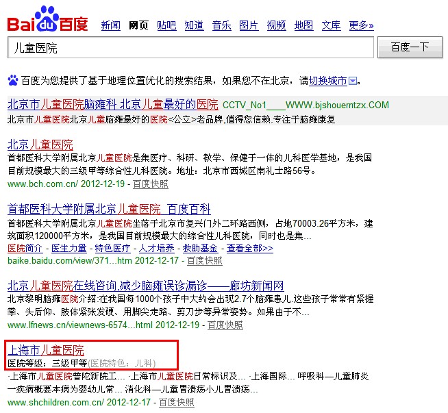 百度“儿童医院”搜索结果