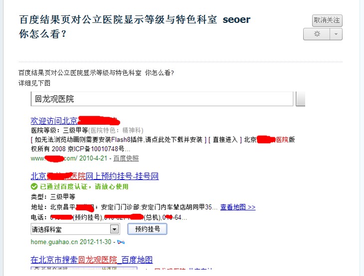 余斗在这之前还没发现这个问题,惊奇之下搜索了几个余斗所从事的医疗行业关键词,发现并不是像这位提问者这样,至少我们主要优化的关键词还没看到类似公立医院的级别信息展现,余斗又试着搜索了其他的关键词,结果如下: