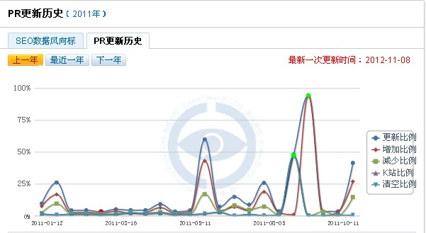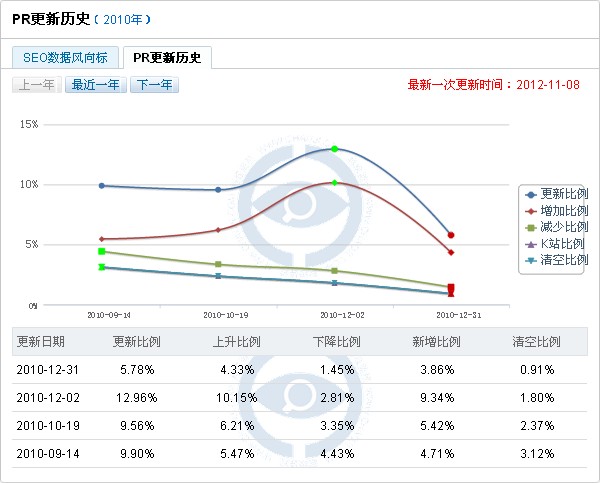 在2011年里PR值的更新是比较不规律的,从1月份开始一直到11月份都在小幅度更新,除了10月8号的接近百分之百的更新之外,其余的都是小幅度的更新,而且也毫无规律可言。 再看一下2010年的PR更新风向标:
