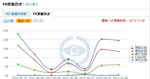 PR值是谷歌对于一个网站的评级,等级越高则说明网站越受欢迎。站长对于PR值的关注度丝毫不亚于百度权重,甚至是每次交换友情链接的时候,PR值是会被放在首位的。在2012年里PR值较大的更新有4次,2月份一次,5月份三次(小更新),8月份一次,11月份一次,最近的一次更新是在11月8日。根据今年的PR更新数据来看,PR值更新大概每三个月一次,都是在月初更新。笔者的网站建站4月份,是在8月3日的更新中PR更新到3的。2012年基本上PR是不会更新了,下面我们来看预测一下2013年PR值的更新情况。 我们先来看一下2012年PR更新的风向标: