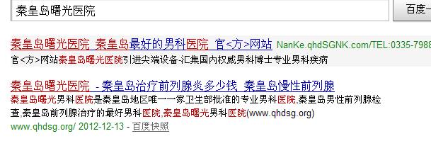 (我们再来看看他的主医疗站效果吧) 主站是常见的医疗网站,百度收录很多,权重却是一点也没有,我想这也是很多做医疗网站朋友遇到的问题吧? 所以,医疗的朋友不妨试试公司类型网站来保住自己的品牌词吧,品牌词包括:医院名称、医院地址、医院联系方式等等。 行销站优化主关键词(暂且就叫它主关键词吧),比如我院的行销站关键词:秦皇岛男科医院,秦皇岛男性医院,秦皇岛最好的男科医院,秦皇岛专业男科医院等等。 行销站具体怎么做,大家就自己动手去网上考察吧,我个人对此类型的网站定位是:类新闻稿文章发表平台,比如:秦皇岛最好的男科医院是哪家?这样的标题,文章就是介绍我院的优点,简单提到技术和设备,但是不设计到任何疾病症状、病因、治疗方法等等。 下面看看前天上线的两个网站效果吧!(ps:这两个网站都是在提交百度之后1分钟内收录,本来打算写一篇文章,但是看到已经有人在A5发表类似的文章,就取消了这个念头,个人认为这是百度近期算法的改变,或者就是我们运气比较好,并不存在什么优化技巧!)