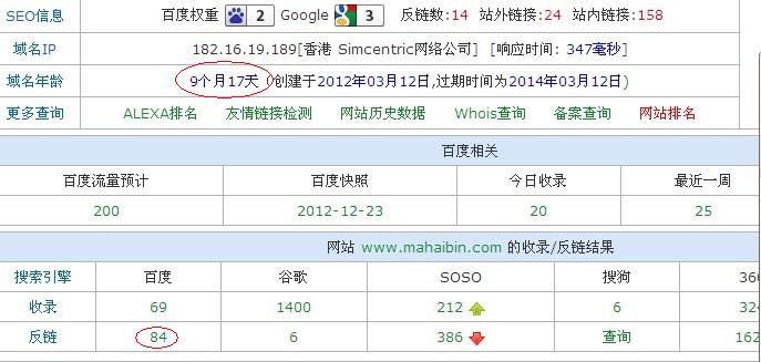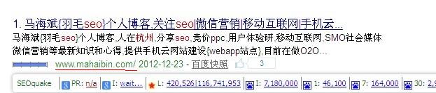可是,你看看,这标题这描述也没像是有故意堆砌。连个“杭州”,都出现在描述里。 2.购买大量黑链,求短期排名。 可博主说这个站,他根本就没怎么去管,还是手下一美女助理帮忙转载编写的。 3.运气罢了。 这是一位我的一位朋友抛出的观点,也只能是个人观点了。最后,博主说出了自己的一些看法这个博客域名虽然是新域名,其实也是博客却不“新”, 他一起用的是其他域名,好几年了,排名一直不错,不过在六月份被K了,就换了这么一个姓名域名,可能是老域名被百度恢复排名,权重传递的新域名了,还有也许是自己的“无为而治”起到的效果。笔者,回家通过工具也看看这个网站的情况,发现这个网站正如博主自己说的应该是老域名的权重传递。 原因是,通过seoquake我发现,这个网站的来路域名有54,反链总数是10421,我想既然博主说现在自己不去刻意发外链,那这么多的外链应该是老域名的权重传递,还有锚文本外链的助力。