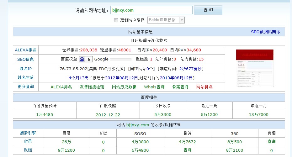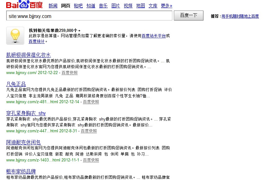 大家可以看到域名年龄:4个月1天, 百度收录26w,反链9w120,数字相当惊人。它是如何在短短四个月达到如此效果的呢?笔者简单的做一下分析,欢迎大家吐槽。这个网站是一个经典的SEO黑帽案例,这个案例的意义就是告诉我们黑帽SEO一直存在(针对百度),网站应该是利用了以前比较流行的桥页作弊手法,黑帽中的一种桥页生成无限页面跟这个性质差不多,如果做暴利行业或者插边球行业网站能坚持半个月就有赚的。不管什么互联网行业公约,赚到钱就是真理。这种方法在这个网站几乎应该是应用到极致,高人级别的SEO手段,我猜应该是团队操作的结果吧。话说黑帽网站一般活不长,大家可以看到GOOGLE已经识别出来是桥页作弊,百度还没有识别出来,百度往往都是慢一步。 桥页作弊的手法根据用户代理不同,返回不同的页面,即用户打开页面自动跳转到广告页,而蜘蛛爬行时返回是他们特别优化的网站页面,蜘蛛爬行页面内容可以通过百度快照查看。这就是这个看上去什么都没有的网站为何收录和排名会这么好的原因。目前,这种作弊手法,谷歌很早就能识别了,你可以去谷歌搜索下这个网站,估计都没有收录。有人会说,这只是昙花一现,很快就会被K的,笔者认为SEO的根本目的就是赚钱,无论这个网站黑帽还是白帽都值得让我们研究,毕竟这个网站给它们带来了不少的利润。但是笔者并不是建议大家也去研究所谓的SEO黑帽,其实这只是一个案例,无需过于关注,做好你自己的事情。只要你认真做内容,你的站一定不会差。下面我们来看看这个网站有什么可借鉴的地方,到底为什么这么牛? 牛在他大量、高质量的“原创文章”。有人会说:他只是聚合了淘宝的标题而已,怎么能称得上高质量原创的文章呢?首先他能这么操作的原因是:淘宝屏蔽百度蜘蛛;如果没有这个先决条件,一切无从谈起。以前作弊靠互链,现在作弊靠内容,而他的操作手法恰好迎合了这段时间百度的调整,即对原创内容的要求。其次就是选取真正的有价值的长尾关键词,大家可以看到他的关键词不但有指数,而且竞争小,想必在关键词这方面肯定是下了不少功夫。其实这些都不是最重要的,通过这个案例我们能知道: 1.在较长的一段时间内,SEO还是有价值的。不像是有些人所说的SEO已死,笔者认为SEO就是被这些黑帽做死的。一个良好的SEO环境才可能让SEOer更好的发展下去,每次搜索引擎惩罚黑帽都会连累一批白帽SEO工作者,所以SEO才会越来越难,门槛越来越高。 2.研究搜索引擎算法调整。一个真正的SEO高手不是每天的去定时更新内容和外链,SEO真谛是迎合搜索引擎的胃口,研究每次的算法调整,寻找一个良好的优化策略,才会在最短的时间达到最好的效果,笔者认为这不算是黑帽,应和需求满足需要才是一个SEO真正要做的事情。 笔者还发现一个类似这样的桥页作弊手法的网站,大家可以去查一查: