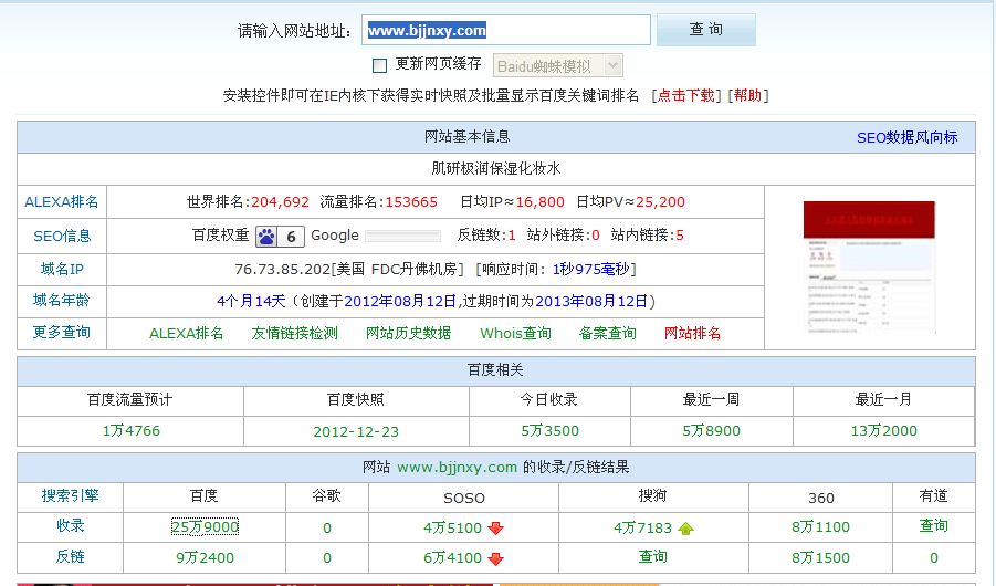 从上图我们可以看出来第一个问题,网站才4个月,权重竟然是6,但是PR没有,这应该跟两个搜索引擎的更新速度有关。百度更新的太快,谷歌更新的太慢。百度快照隔天,说明网站的首页更新很正常,国外的空间,打开速度很快,没有友情链接。