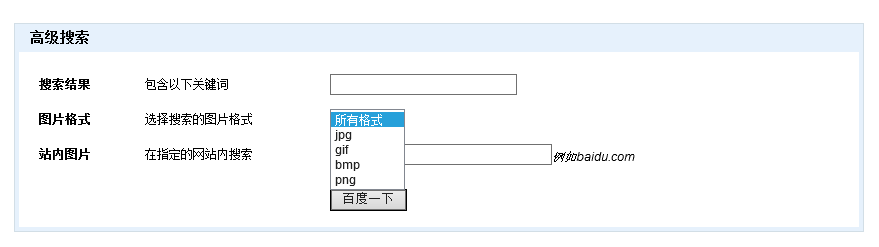 1.图片格式; 这是在百度图片搜索首页点击-高级之后进入的高级搜索截图,通过这个界面我们可以直观的发现,除却关键词和图片限定网址之外,目前百度可以提供jpg、gif、bmp、png四种格式的图片检索,也就是说,百度在收录图片的时候,图片格式将作为一个信息点被抓去并建立索引。